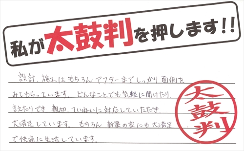 設計、施工はもちろんアフターまでしっかり面倒をみてもらっています。どんなことでも気軽に聞けたり言えたりでき、親切、ていねいに対応していただき大満足しています。もちろん、新築の家にも大満足で快適に生活しています。