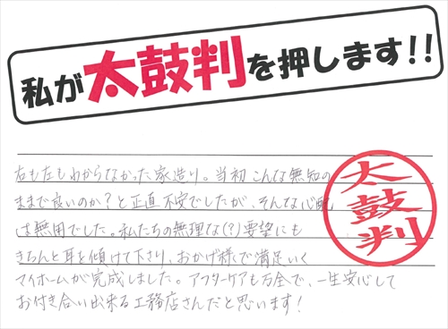 右も左もわからなかった家造り。当初こんな無知のままで良いのか?と正直不安でしたが、そんな心配は無用でした。私たちの無理な(?)要望にもきちんと耳を傾けて下さり、おかげ様で満足いくマイホームが完成しました。アフターケアも万全で、一生安心してお付き合いできる工務店さんだと思います!
