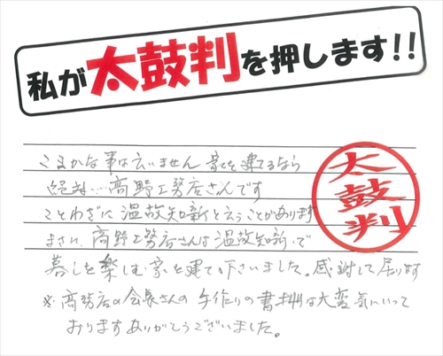 こまかな事は云いません。家を建てるなら絶対…高野工務店さんです。ことわざに温故知新と云うことがあります。まさに、高野工務店さんは温故知新で、暮らしを楽しむ家を建てて下さいました。感謝して居ります。※高野工務店の会長さんの手作りの書棚は大変気にいっております。ありがとうございました。
