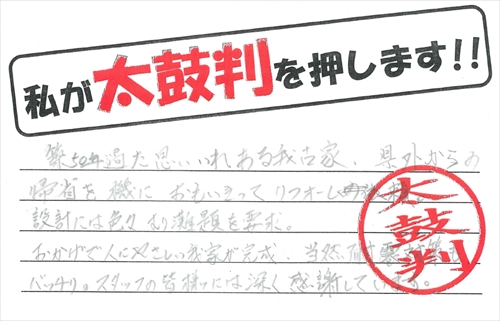 築50年過ぎた思いいれある我古家。県外からの帰省を機に、おもいきってリフォーム依頼。設計にはいろいろむり難題を要求。おかげで人にやさしい我家が完成。当然耐震対策もバッチリ。スタッフの皆様には深く感謝しています。