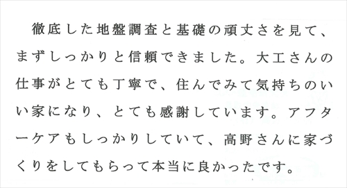 徹底した地盤調査と基礎の頑丈さを見て、まずしっかりと信頼できました。大工さんの仕事がとても丁寧で、住んでみて気持ちのいい家になり、とても感謝しています。アフターケアもしっかりしていて、高野さんに家づくりをしてもらって本当に良かったです。