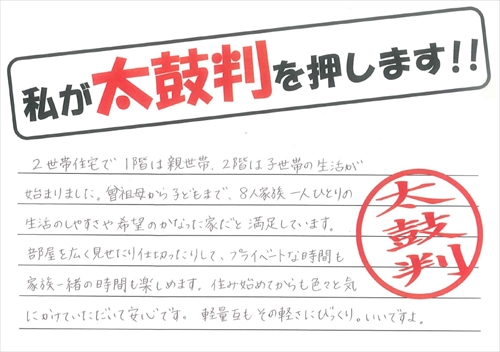 2世帯住宅で、1階は親世帯、2階は子供世帯の生活が始まりました。曾祖母から子どもまで、8人家族一人ひとりの生活のしやすさや希望のかなった家だと満足しています。部屋を広く見せたりし切ったりして、プライベートな時間も家族一緒の時間も楽しめます。住み始めてからも色々と気にかけていただいて安心です。軽量瓦もその軽さにびっくり。いいですよ。